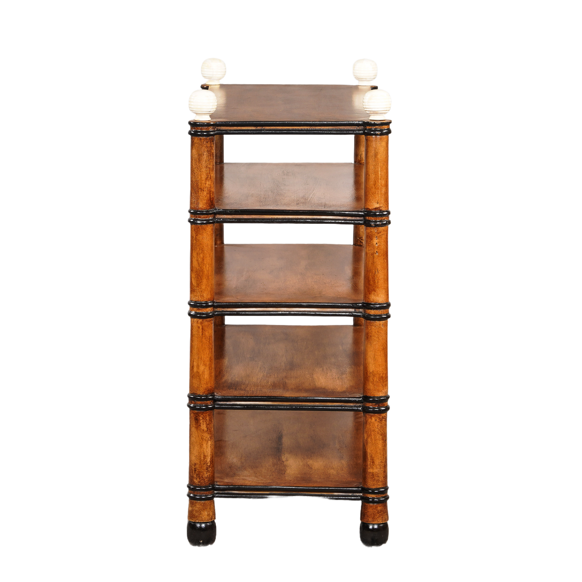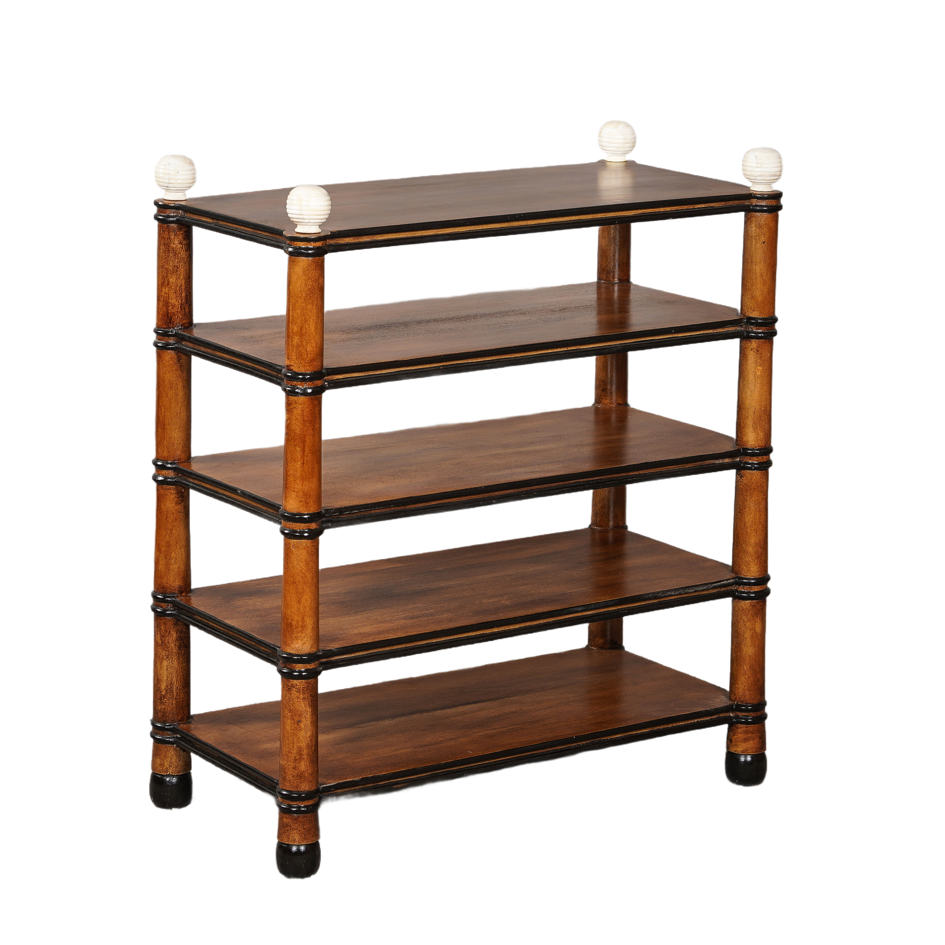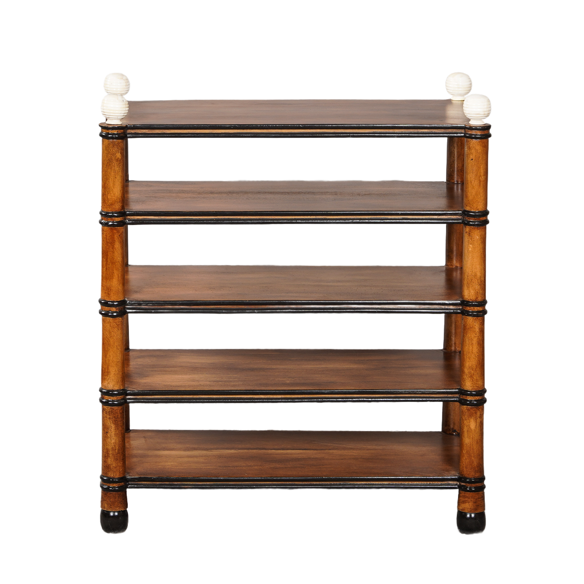 Hand crafted Andres Table, designed with five shelves. Made with high-quality timber and finished with a black trim, this table also features stunning bone inlay detailing at the top.