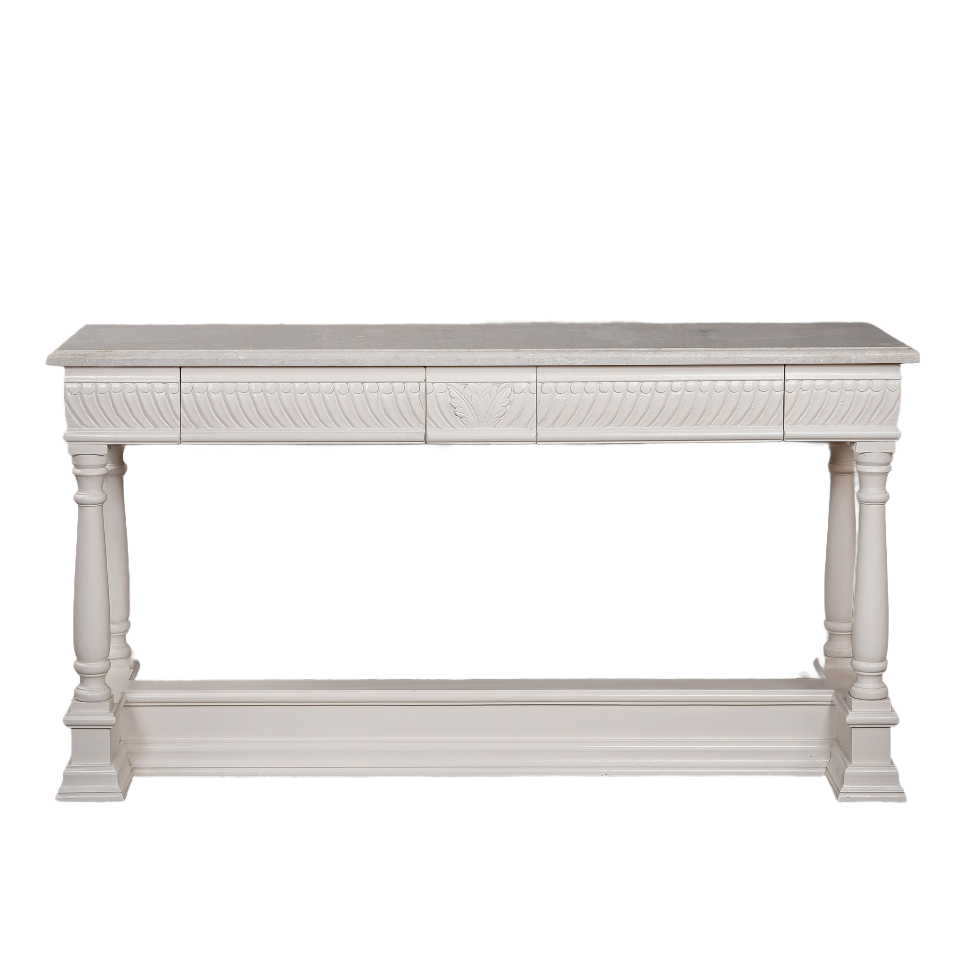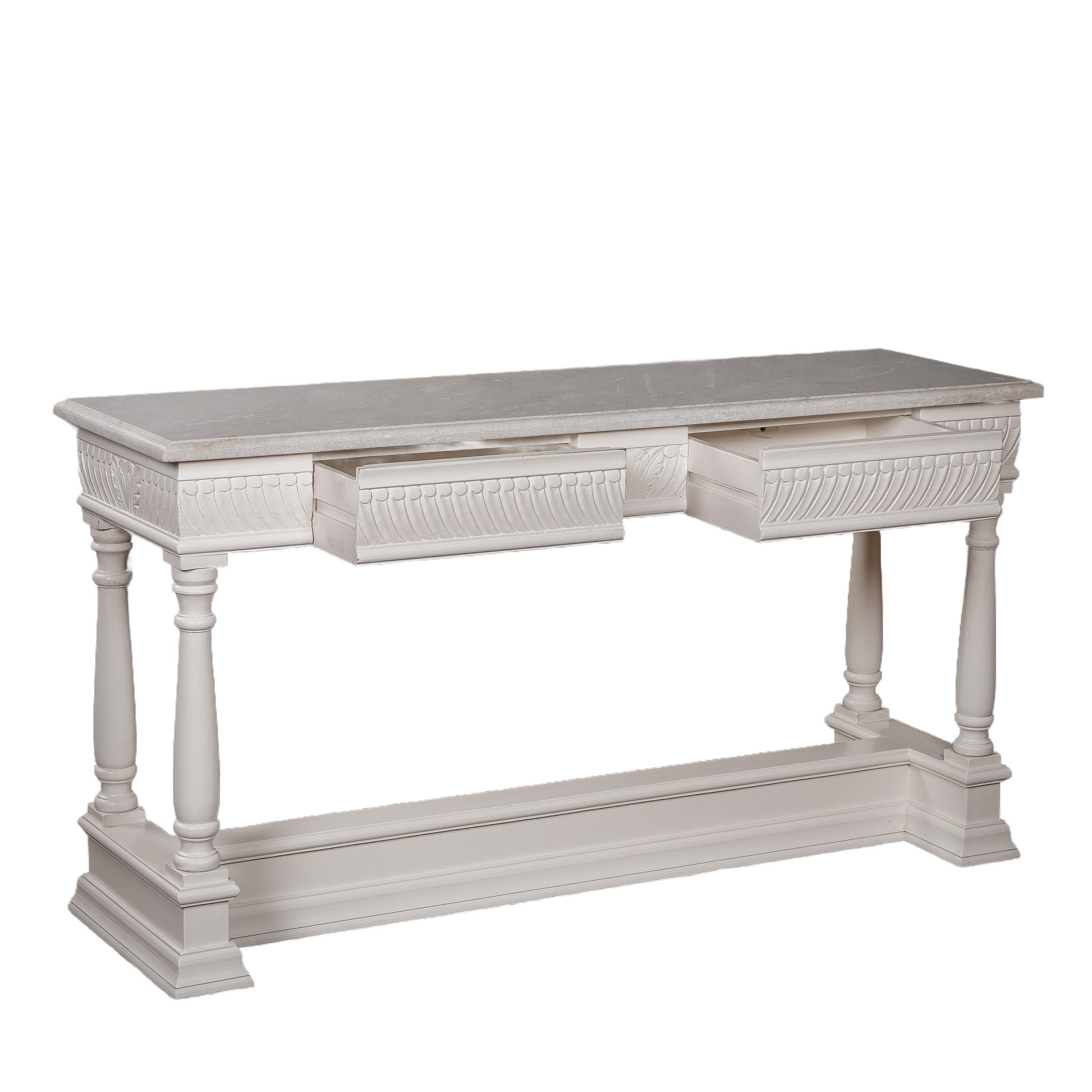 Crafted by skilled artisans, the Greenwich Console boasts two drawers with intricate details and a smooth alabaster marble top.