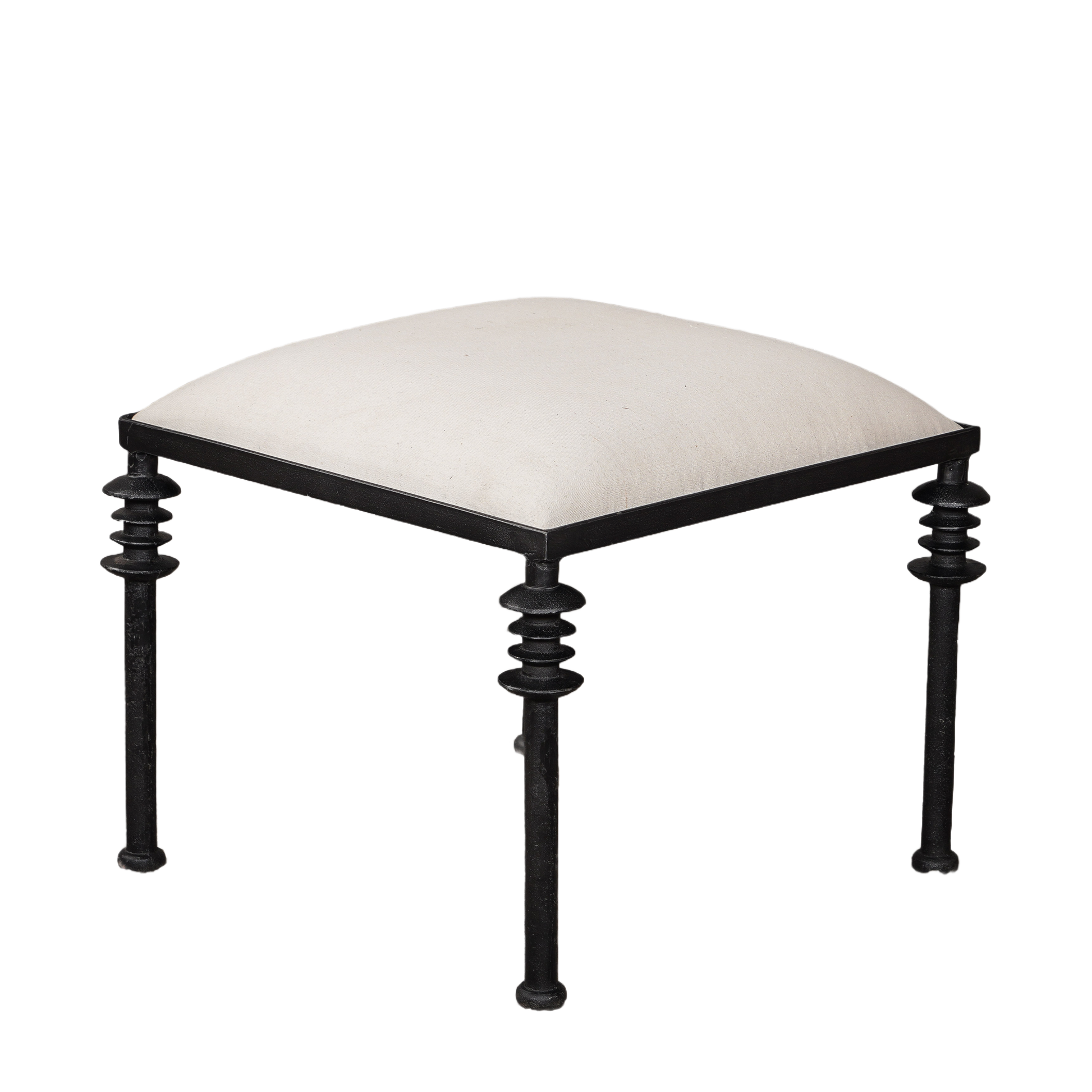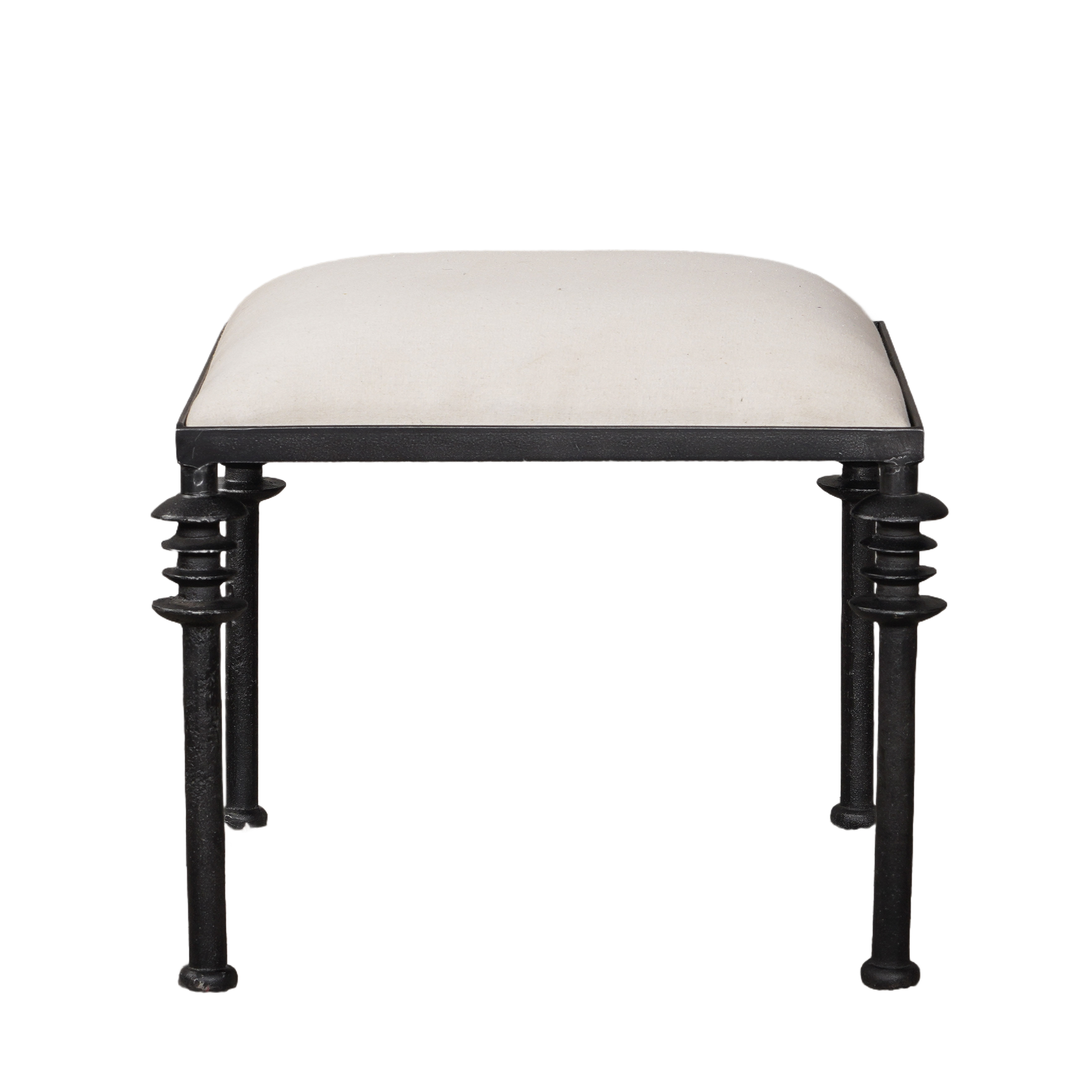The Lorenzo Bench. Crafted with stacked iron details and a comfortable linen upholstered seat cushion.