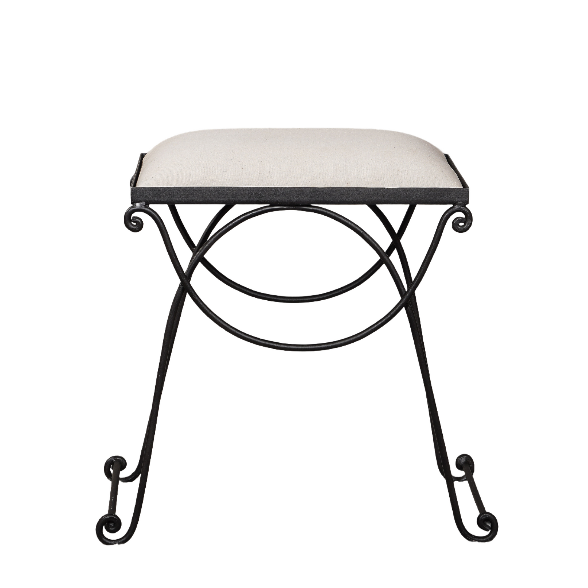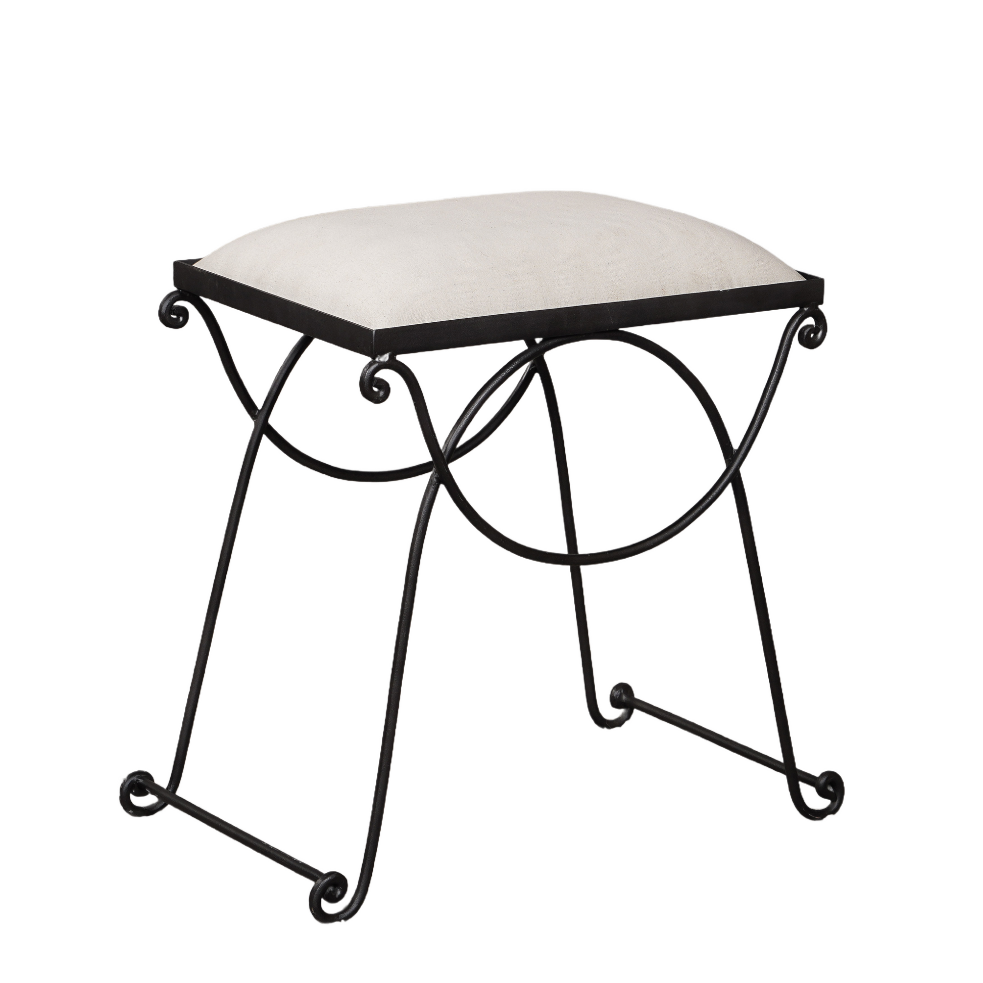 The Selena Ottoman features a curved and looped iron base, complemented by a comfortable linen seat cushion.